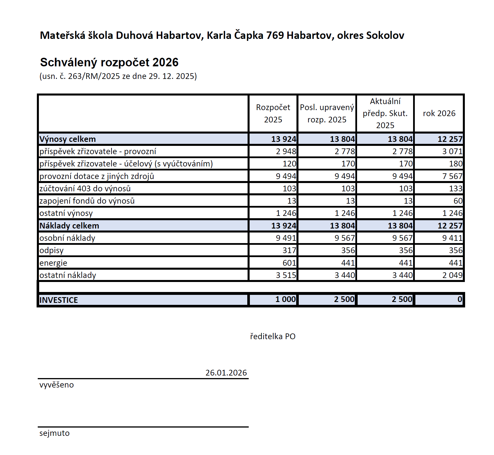 Schválený rozpočet na rok 2026
